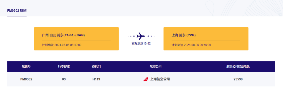 8月6日,潇湘晨报记者查询上海机场官网,显示FM9302航班计划到达时间是8月5日9点40分,实际到达时间为10点52分。MU269的离港时间为12点20分,实际出发为12点52分。