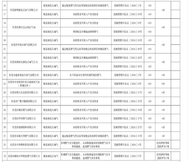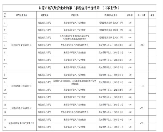 东莞市城市管理和综合执法局发布公示,对外通报东莞市燃气经营企业2024年第二季度信用评价结果。结果显示,东莞市宝山煤气有限公司等18家燃气企业的信用评价结果显示为“不良行为”,东莞市厚龙燃气有限公司等3家燃气企业信用评价结果为“良好行为”。其中,东莞市兴化燃料贸易有限公司等2家燃气企业信用评价等级直接评为C级。