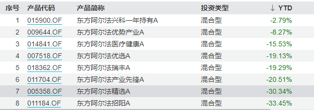 其中,东方阿尔法基金的创始人、总经理刘明,管理的东方阿尔法精选A、东方阿尔法招阳A年内回报分别为-30.34%、-33.45%,该业绩不仅在公司垫底,在行业也排名倒数。