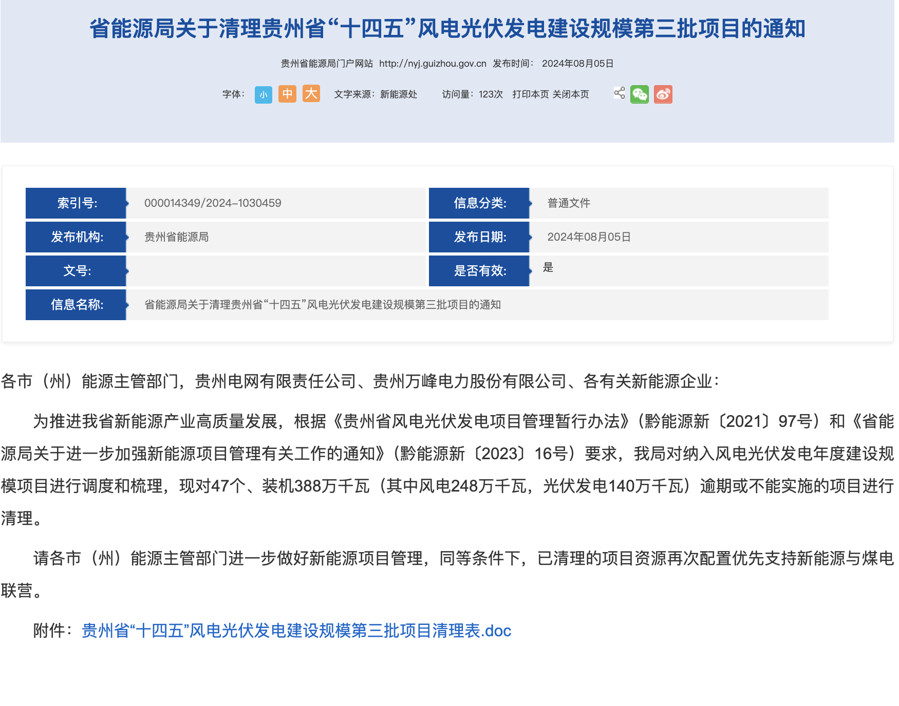 8月5日,贵州省能源局下发《关于清理贵州省“十四五”风电光伏发电建设规模第三批项目的通知》,对47个逾期或不能实施的项目进行清理,装机388万千瓦,其中风电248万千瓦,光伏发电140万千瓦。
