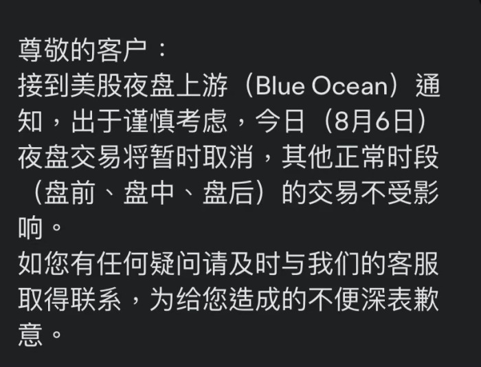 富途8月6日再发公告称,接到美股夜盘上游(Blue Ocean)通知,出于谨慎考虑今日(8月6日)夜盘交易将暂时取消,其他正常时段(盘前、盘中、盘后)的交易不受影响。