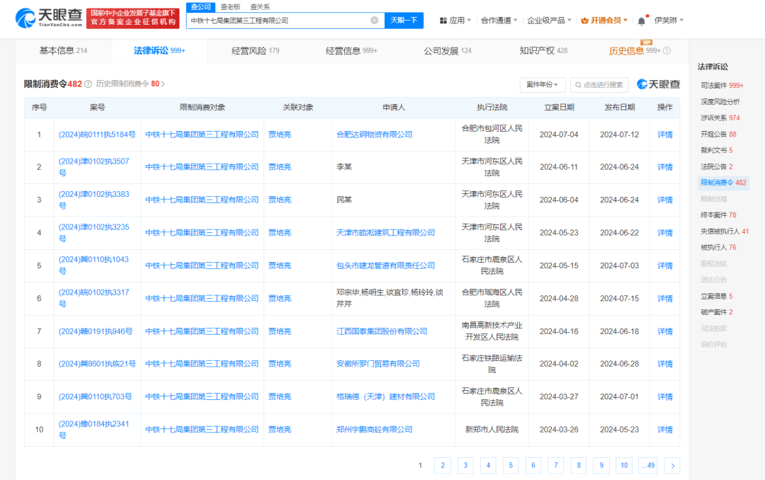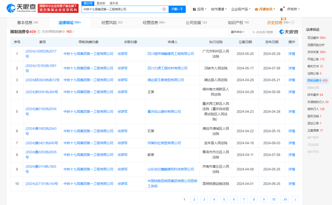 天眼查显示,截至7月26日,中铁十七局集团旗下的第一、第三、第五、第六工程有限公司,以及中铁十五局集团第一工程有限公司涉及限制高消费(来自法院公布过的限制高消费文书,不排除部分案件已还款)的案件数合计超过1000起。