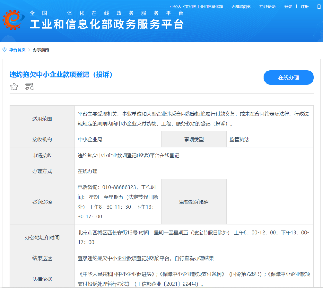记者查询发现,工业和信息化部政务服务平台首页上有“违约拖欠中小企业款项登记(投诉)”,被拖欠者可在线办理登记。