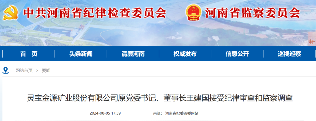 据三门峡市纪委监委消息:灵宝金源矿业股份有限公司原党委书记、董事长王建国涉嫌严重违纪违法,目前正接受三门峡市纪委监委纪律审查和监察调查。