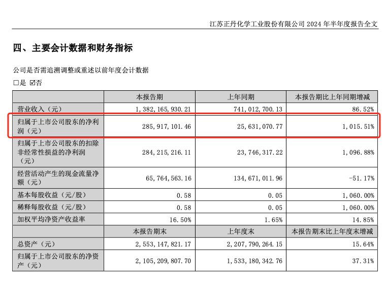 8月5日晚,正丹股份(300641)披露2024年半年报,公司今年上半年实现营业收入13.82亿元,同比上升86.52%;实现归母净利润2.86亿元,同比上升1015.51%。