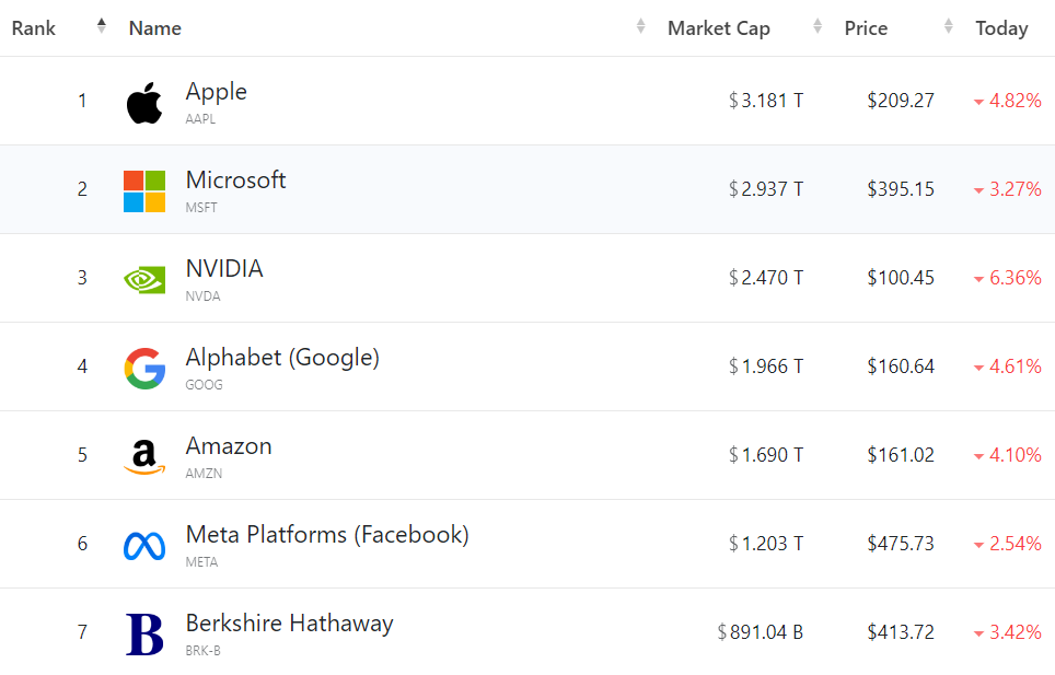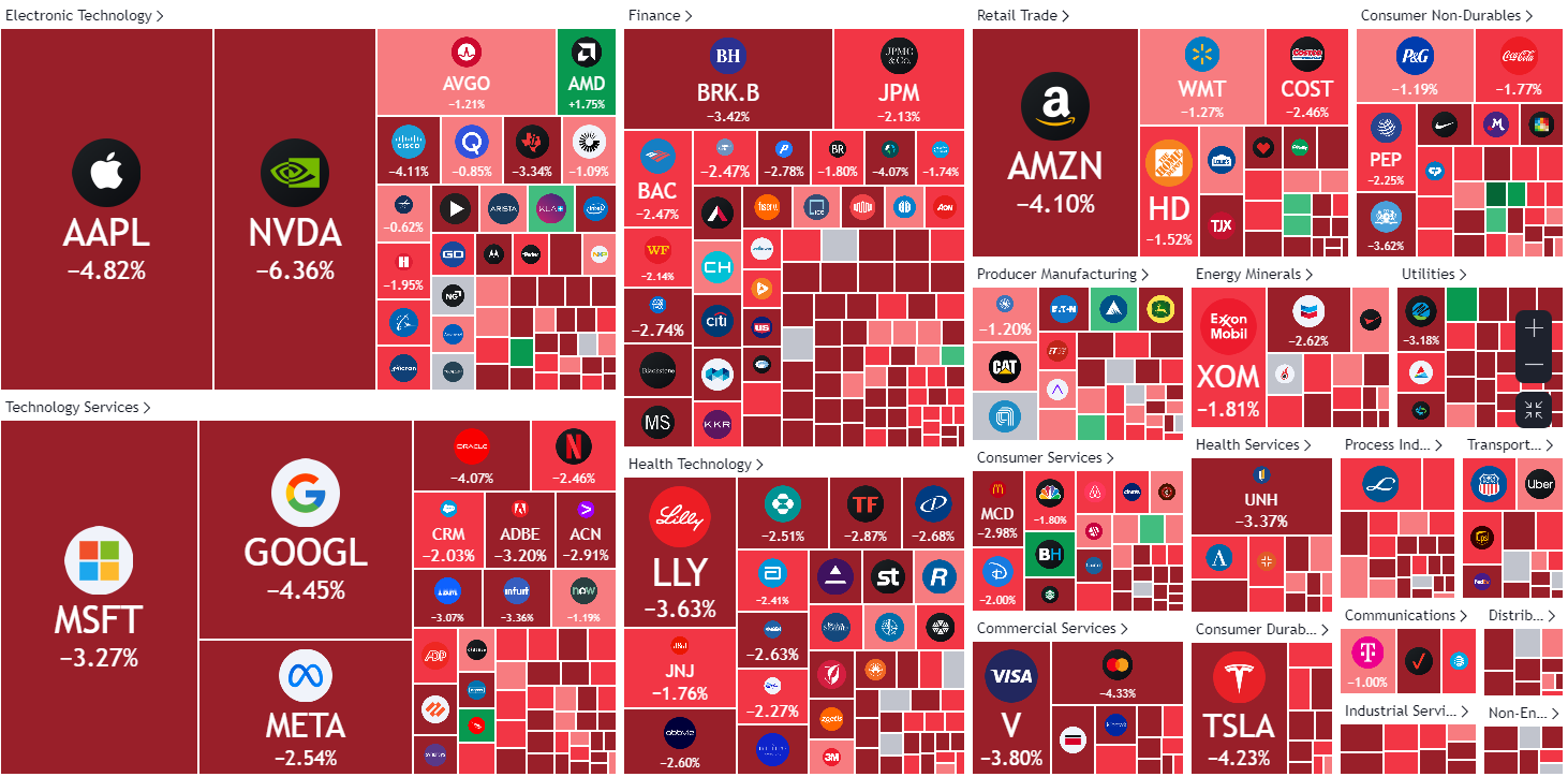 大型科技股集体暴跌,(按市值排列)苹果收跌4.82%,盘中一度跌超10%;微软跌3.27%;英伟达跌6.36%,一度跌超15%;谷歌C跌4.61%,亚马逊跌4.10%,Meta跌2.54%;特斯拉跌4.23%。