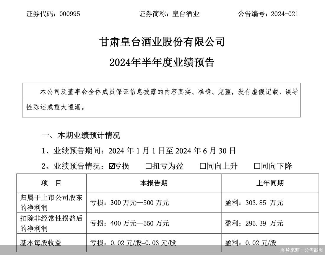 正如皇台酒业在公告中所说,“染酱”是企业为了寻求新利润增长点,这背后是皇台酒业持续下滑的业绩。皇台酒业2024年半年度业绩预告显示,今年1—6月,皇台酒业预计实现净利润为-300万元至-550万元,相比去年同期盈利303.85万元由盈转亏;预计实现扣除非经常性损益后的净利润为-400万元至-550万元,与去年同期盈利295.39万元相比由盈转亏。
