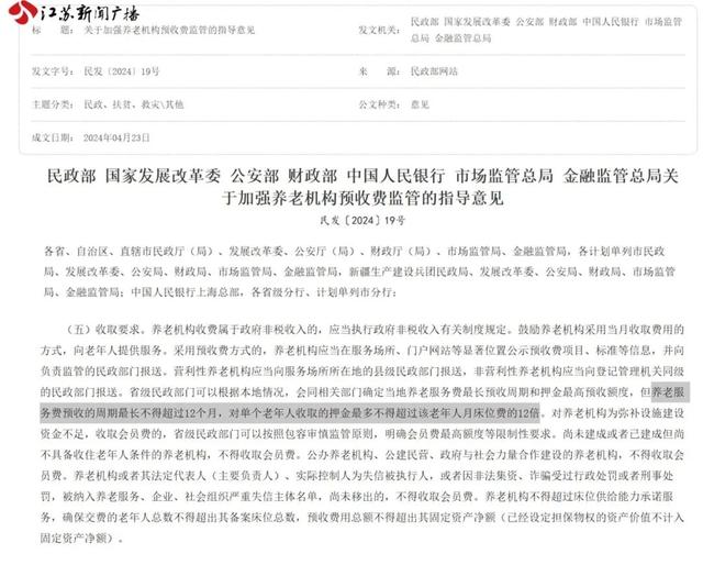 2024年4月23日,民政部、国家发展改革委、公安部、财政部、中国人民银行、市场监管总局、金融监管总局等七部门曾出台《关于加强养老机构预收费监管的指导意见》,要求各地、各部门加强养老机构预收费监管,其中明确规定养老服务费预收的周期最长不得超过12个月,对单个老年人收取的押金最多不得超过该老年人月床位费的12倍。