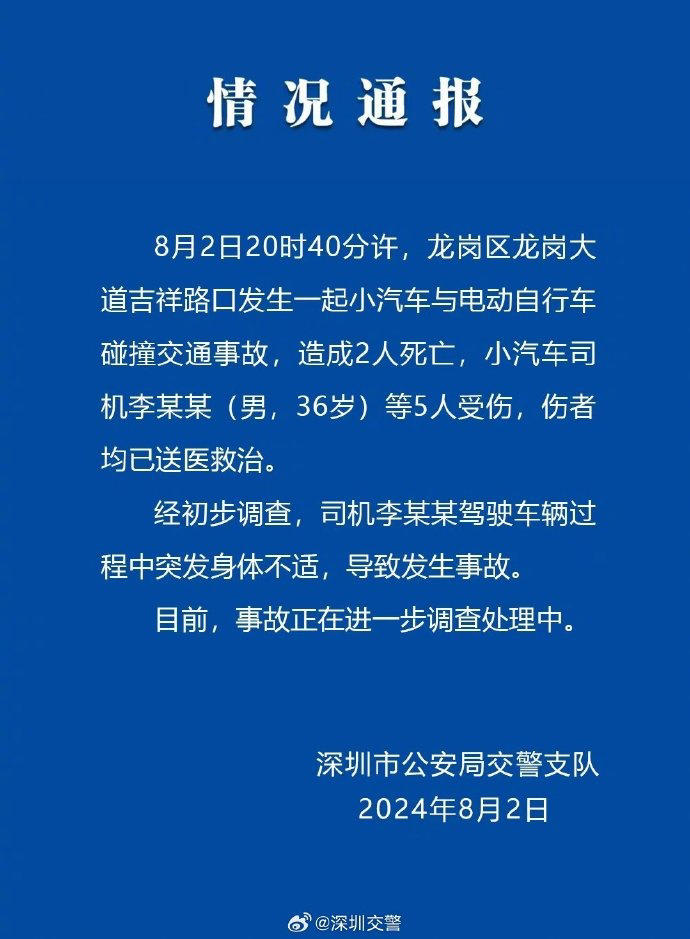 8月2日20时40分许,龙岗区龙岗大道吉祥路口发生一起小汽车与电动自行车碰撞交通事故,造成2人死亡,小汽车司机李某某(男,36岁)等5人受伤,伤者均已送医救治。