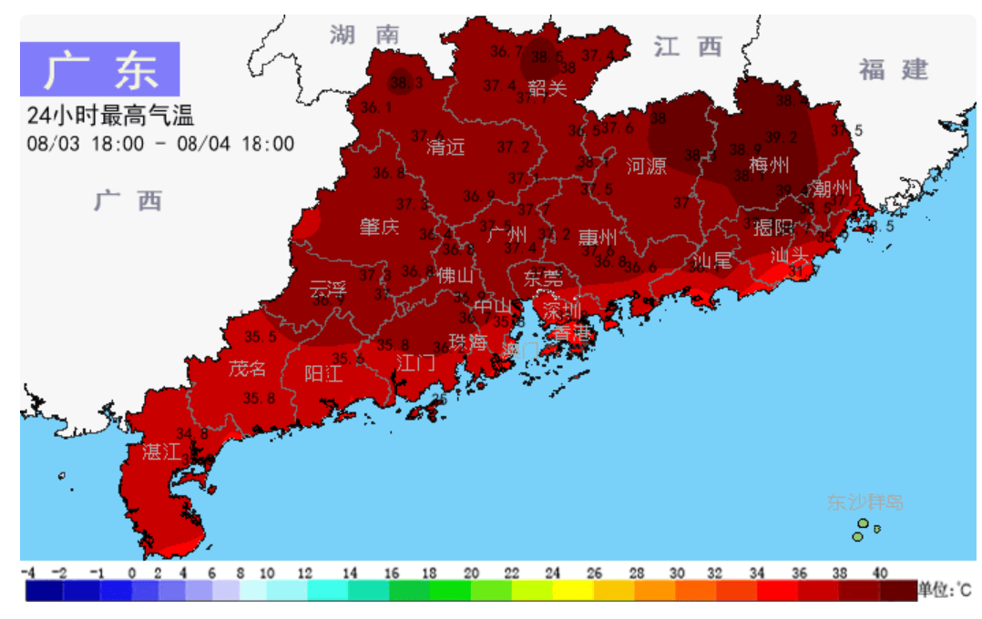 8月4日,广东国家基本气象站录得最高气温超过39℃;广州国家基本气象站录得最高气温37.3℃;而黄埔区长洲街黄埔军校自动气象站录得42.6℃,为广州非国家级站点当天最高气温。