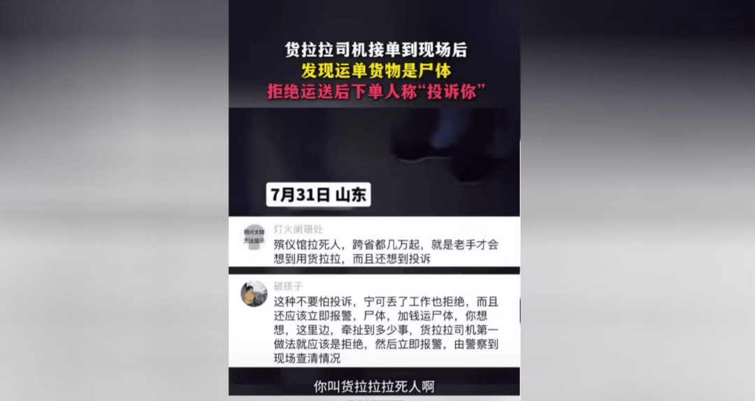 据报道,近日,山东一货拉拉司机接单到达现场后,发现运单货物是遗体。司机师傅拒绝运送,客户称“给你加点钱咋样”。