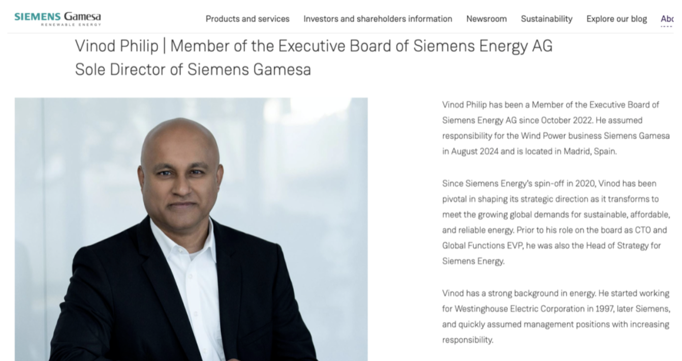 近日,国际风电整机巨头西门子歌美飒已正式完成“换帅”:Vinod Philip正式履新,成为西门子歌美飒新一任首席执行官。目前官网已经完成更新;原首席执行官Jochen Eickholt已经于7月31日正式卸任。