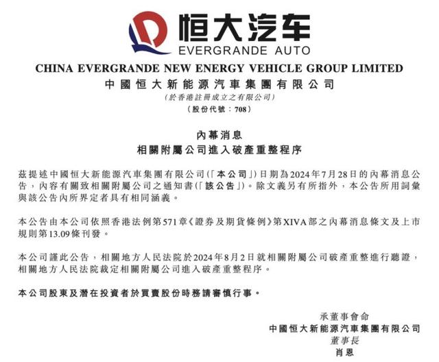 8月5日早间,恒大汽车在港交所公告称,相关地方人民法院于2024年8月2日就相关附属公司(恒大新能源汽车及恒大智能汽车)破产重整进行听证,相关地方人民法院裁定相关附属公司进入破产重整程序。