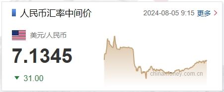 中新网8月5日电 据中国外汇交易中心网站消息,中国人民银行授权中国外汇交易中心公布,2024年8月5日银行间外汇市场人民币汇率中间价为:1美元对人民币7.1345元,上调31个基点。
