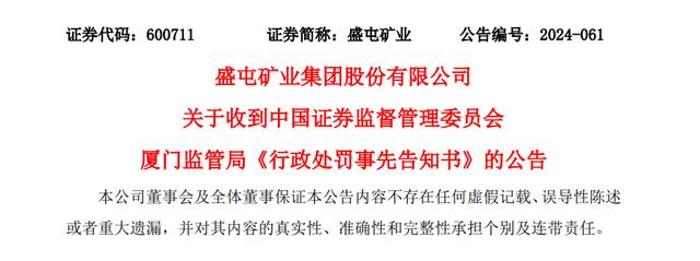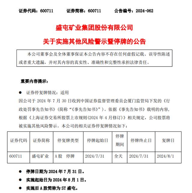 7月30日,盛屯矿业(600711)发布公告,称于2024年5月17日收到证监会厦门监管局《行政处罚事先告知书》的公告,并将实施其他风险警示暨停牌。