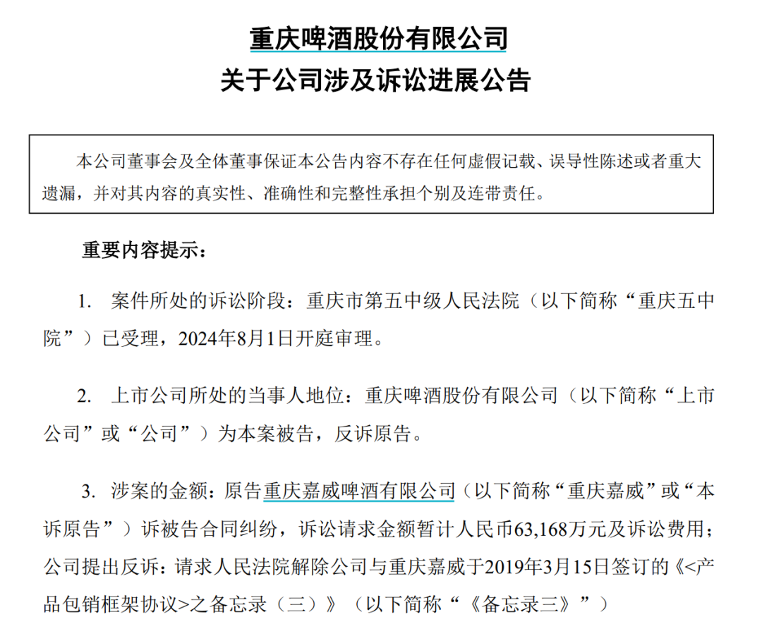 按照重庆啤酒方面披露,重庆嘉威起诉重庆啤酒的案件已经于8月1日开庭,而作为案件的被告,重庆啤酒当庭提交了《民事反诉状》,请求法院解除其与重庆嘉威于2019年3月15日签订的《<产品包销框架协议>之备忘录(三)》(以下简称《备忘录三》)。