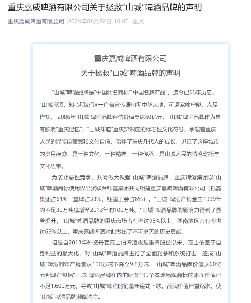 8月2日,重庆嘉威公开发文,直斥嘉士伯入主重庆啤酒后,对旗下的本土啤酒品牌——“山城”啤酒进行了全面封杀,导致该品牌濒临消亡。