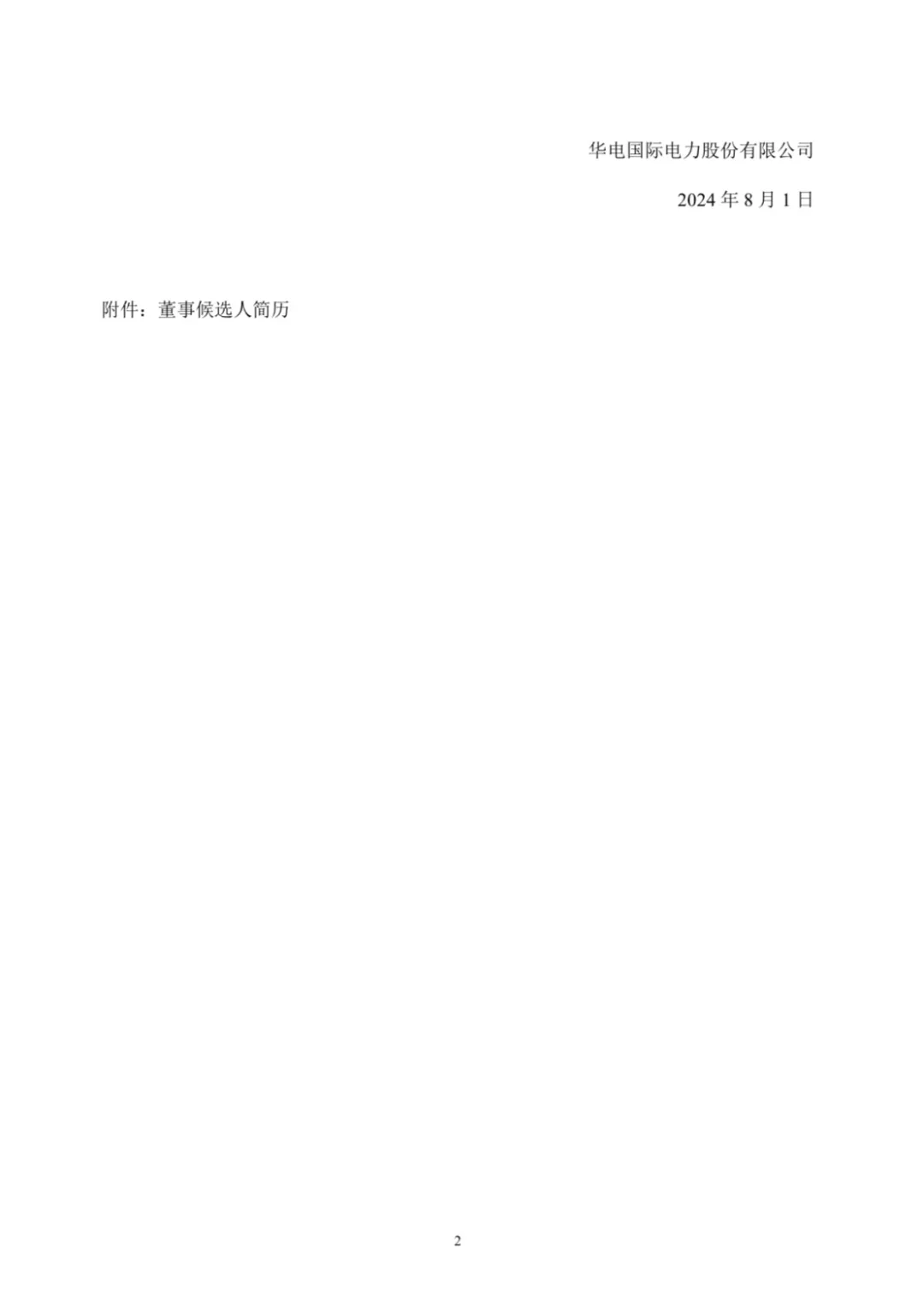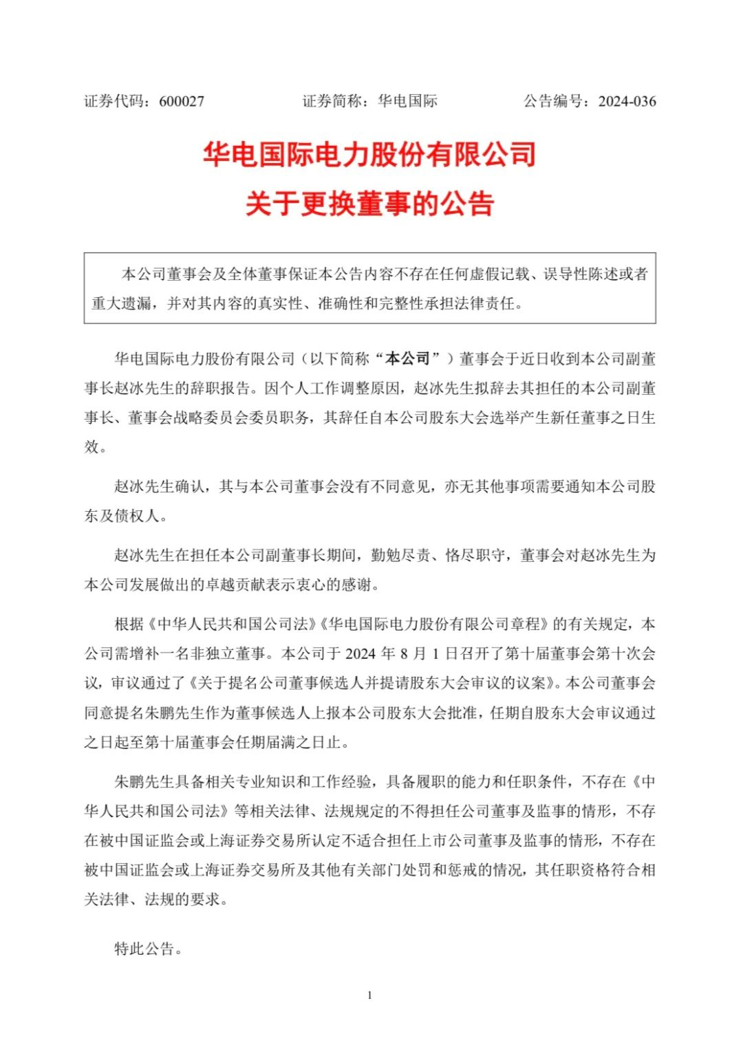 8月1日,华电国际电力股份有限公司公告称,其董事会于近日收到本公司副董事长赵冰先生的辞职报告。因个人工作调整原因,赵冰先生拟辞去其担任的本公司副董事长、董事会战略委员会委员职务,其辞任自本公司股东大会选举产生新任董事之日生效。