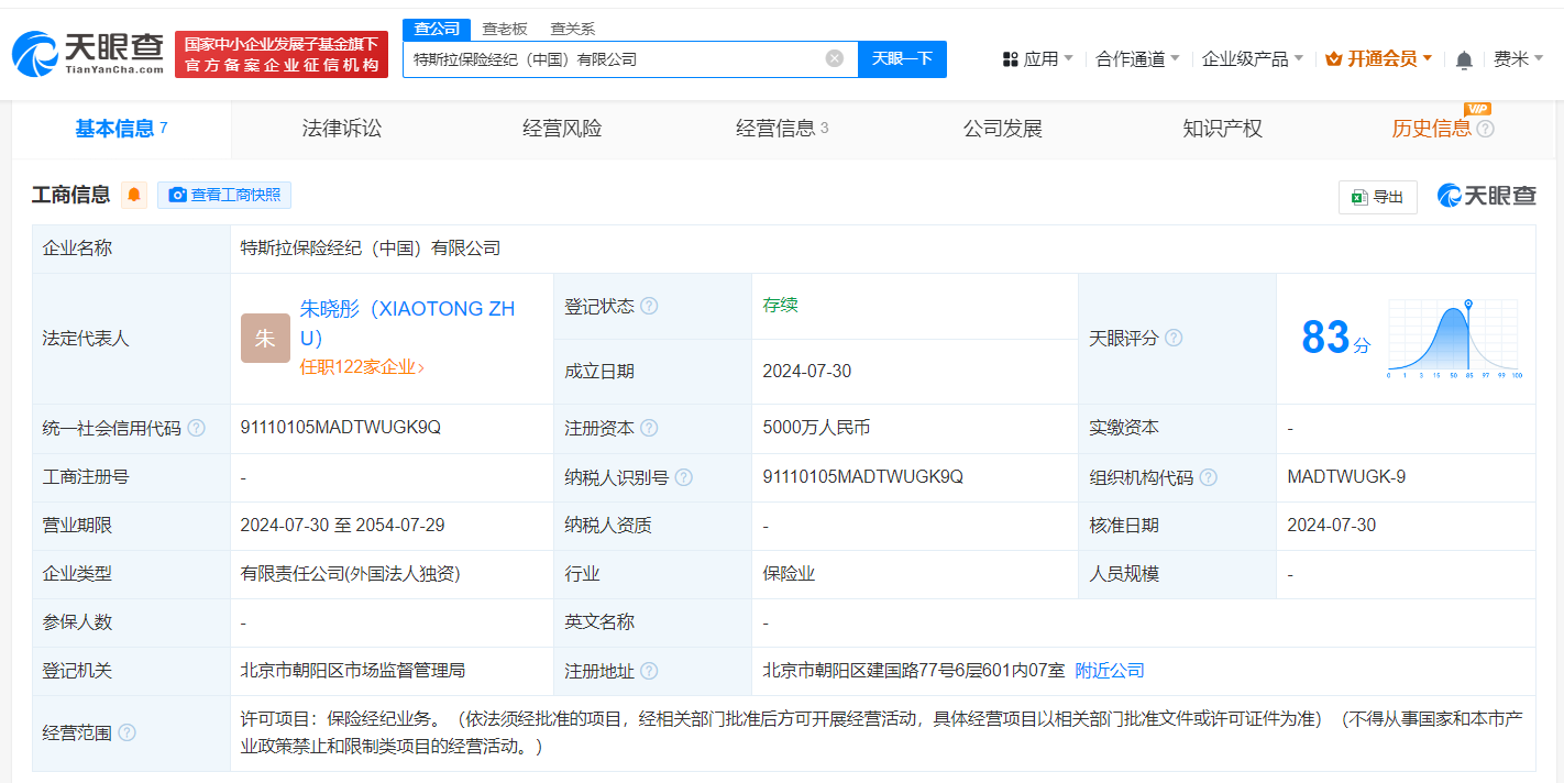 天眼查App显示,近日,特斯拉保险经纪(中国)有限公司成立,法定代表人、董事长为朱晓彤,注册资本5000万人民币,经营范围为保险经纪业务。股东信息显示,该公司由特斯拉保险服务有限公司全资持股。
