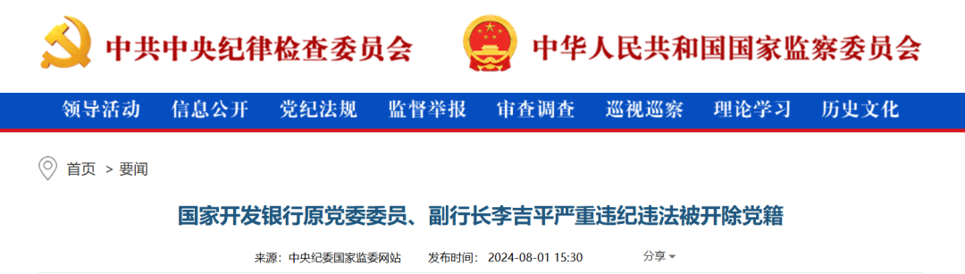 中央纪委国家监委网站8月1日消息,经中共中央批准,中央纪委国家监委对国家开发银行原党委委员、副行长李吉平严重违纪违法问题进行了立案审查调查。