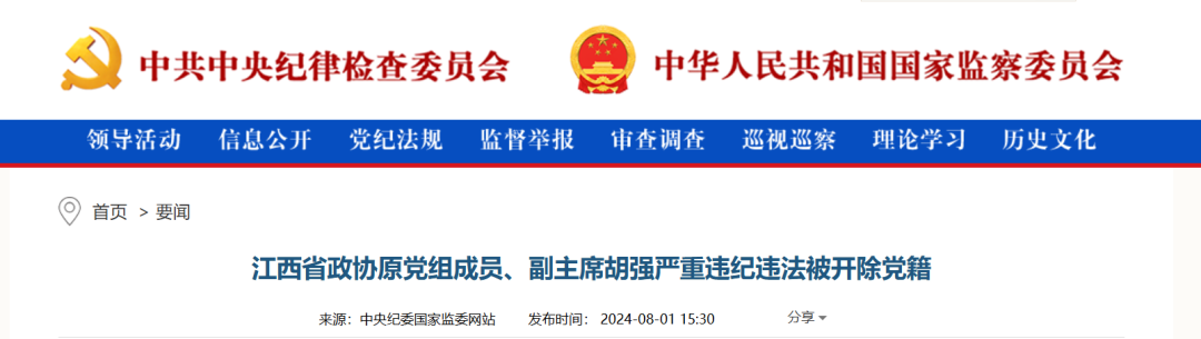 中央纪委国家监委网站8月1日消息,经中共中央批准,中央纪委国家监委对江西省政协原党组成员、副主席胡强严重违纪违法问题进行了立案审查调查。