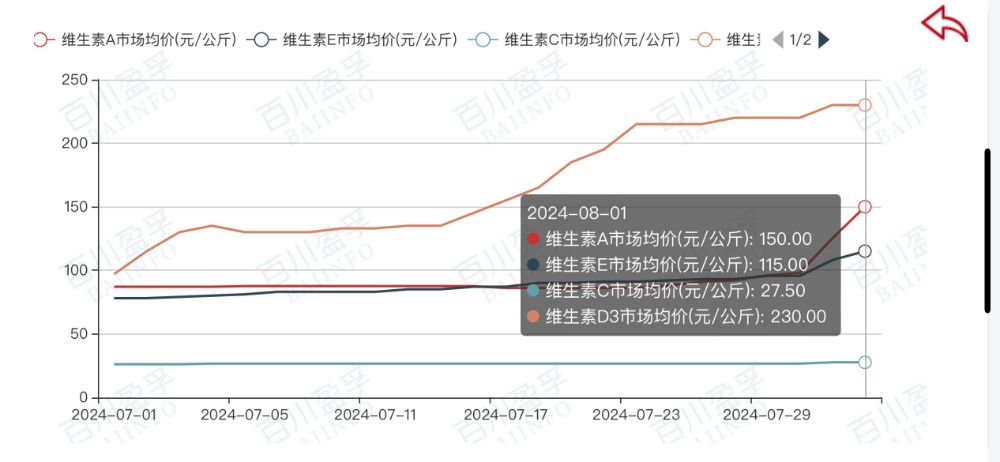 根据百川盈孚数据,维生素价格昨日出现暴涨。数据显示,7月31日,维生素A(VA)均价125元/千克,单日涨幅达到27.55%;维生素E(VE)均价108元/千克,单日涨幅13.09%。 8月1日,维生素A(VA)均价150元/千克,单日涨幅达20%,维生素E(VE)均价112.5元/千克,单日涨幅6.48%。