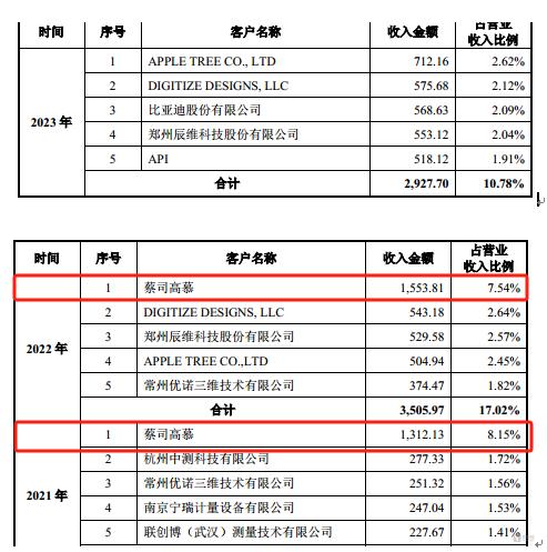 另外,说起思看科技的同行,就不得不提蔡司高慕。招股说明书显示,2021年和2022年,思看科技向蔡司高慕产生的销售收入分别为1312.13万元、1553.81万元,蔡司高慕始终是第一大客户。