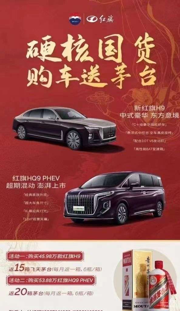 近日红旗汽车的一张促销海报在网络流传。海报内容显示,红旗汽车针对两款车型开展“购车送茅台酒”的活动,其中,购买45.98万元的红旗H9,会返15箱飞天茅台给车主,而购买53.88万元的红旗HQ9 PHEV,则可以返20箱茅台给车主。