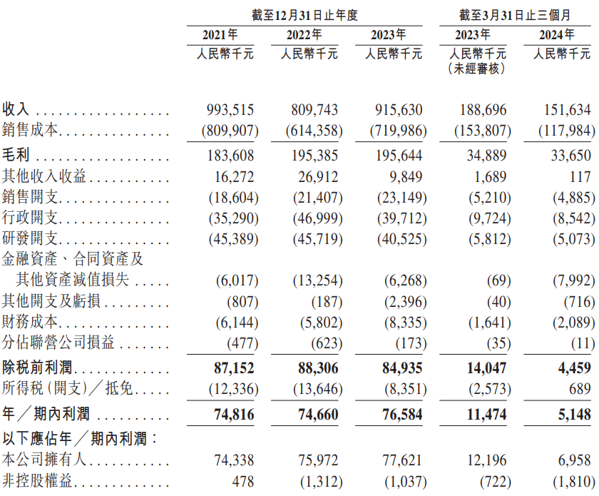 财务数据显示,于2021年、2022年及2023年以及2024年前3月(报告期内),讯众股份的总收入分别为9.94亿元、8.1亿元、9.16亿元及1.52亿元。同期,该公司实现期内利润分别为7481.6万元、7466万元、7658.4万元及514.8万元。