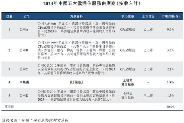 根据弗若斯特沙利文,按2023年收入排名计,讯众股份是中国最大的全栈式云通信服务提供商,且是中国最早提供云通信服务的提供商之一;此外,该公司是中国少数能够提供AI驱动的通信服务的提供商之一。按2023年收入计,讯众股份在中国云通信服务市场排名第四,市场份额约为1.8%。