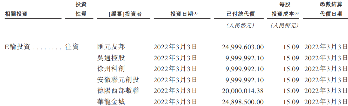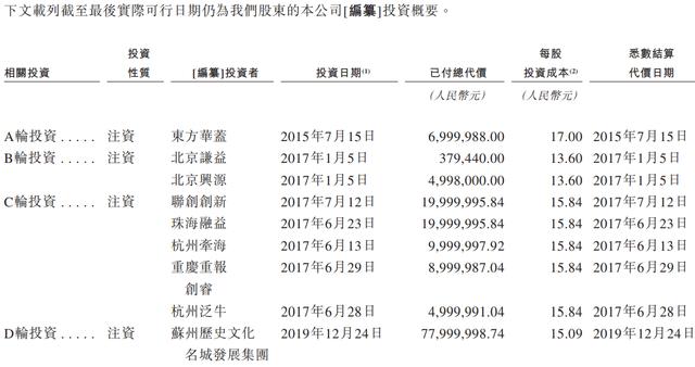 图片来源:讯众股份港股IPO招股书于2015年12月至2022年4月,该公司与投资者进行了多轮投资,其中包括东方华盖、北京谦益、北京兴源、联创创新、珠海融益、杭州牵海、杭州泛牛、苏州历史文化名城发展集团、安徽联元创投、德阳西部数联、华龙金城、汇源友邦、重庆重报创睿、徐州科创及吴通控股。