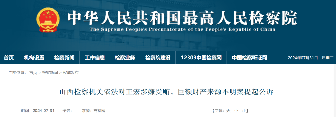 日前,原大同煤矿集团有限责任公司党委常委、工会主席王宏(副厅级)涉嫌受贿罪、巨额财产来源不明罪一案,由山西省监察委员会调查终结,移送检察机关审查起诉。经山西省人民检察院指定管辖,由运城市人民检察院依法向运城市中级人民法院提起公诉。案件正在进一步办理中。