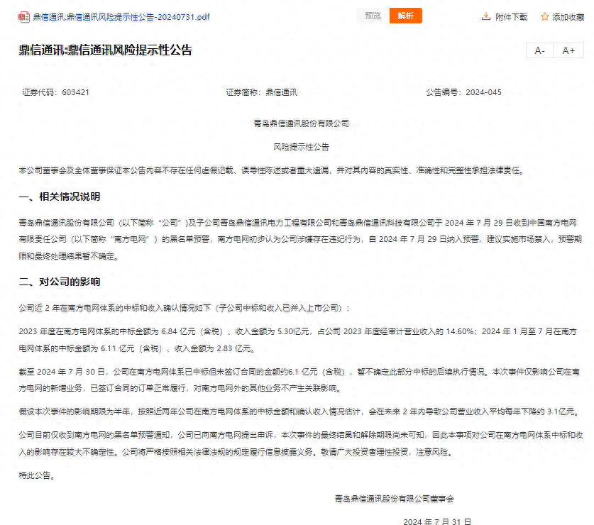 鼎信通讯7月30日晚公告,公司及子公司青岛鼎信通讯电力工程有限公司和青岛鼎信通讯科技有限公司于2024年7月29日收到中国南方电网有限责任公司(简称“南方电网”)的“黑名单”预警,南方电网初步认为公司涉嫌存在违纪行为,自2024年7月29日纳入预警,建议实施市场禁入,预警期限和最终处理结果暂不确定。