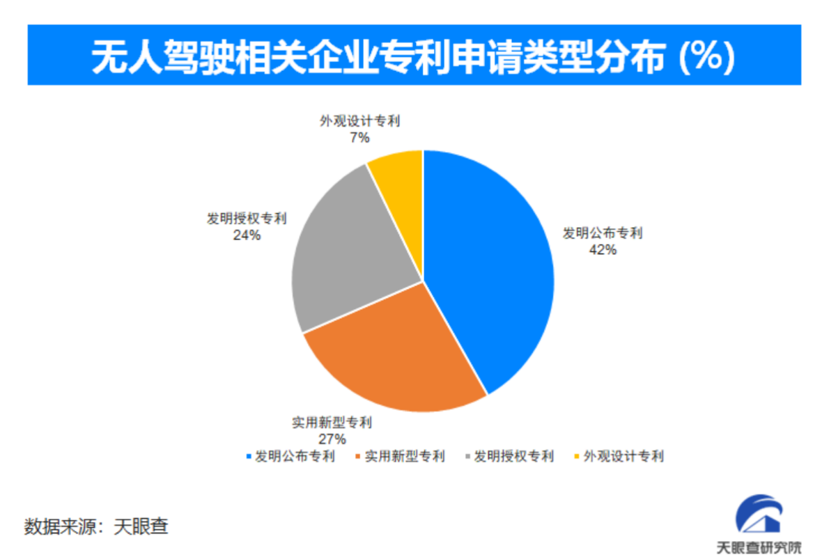 天眼查知识产权信息显示,截至目前,全国范围内无人驾驶领域共产生了14710条专利信息,其中发明公布类专利申请数量最多,占比42%,其次为实用新型专利、发明授权专利和外观设计专利,占比分别为27%、24%和7%,可见技术专利在无人驾驶领域成为重要的专利类型。