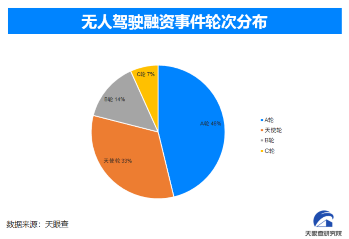 天眼查专业版融资信息显示,截至目前,国内无人驾驶领域共发生融资事件147起。从融资事件轮次来看,A轮融资和天使轮融资占比最高,分别占到了46%和33%;B轮和C轮融资分别占比14%和7%。