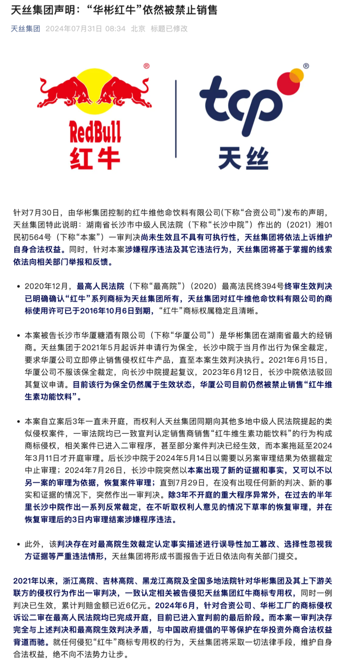 针对昨日红牛维他命饮料有限公司发布的声明,7月31日,天丝集团发布声明称,长沙中院作出的(2021)湘01民初564号(下称“本案”)一审判决尚未生效且不具有可执行性,天丝集团将依法上诉维护自身合法权益。同时,针对本案涉嫌程序违法及其它违法行为,天丝集团将基于掌握的线索依法向相关部门举报和反馈。