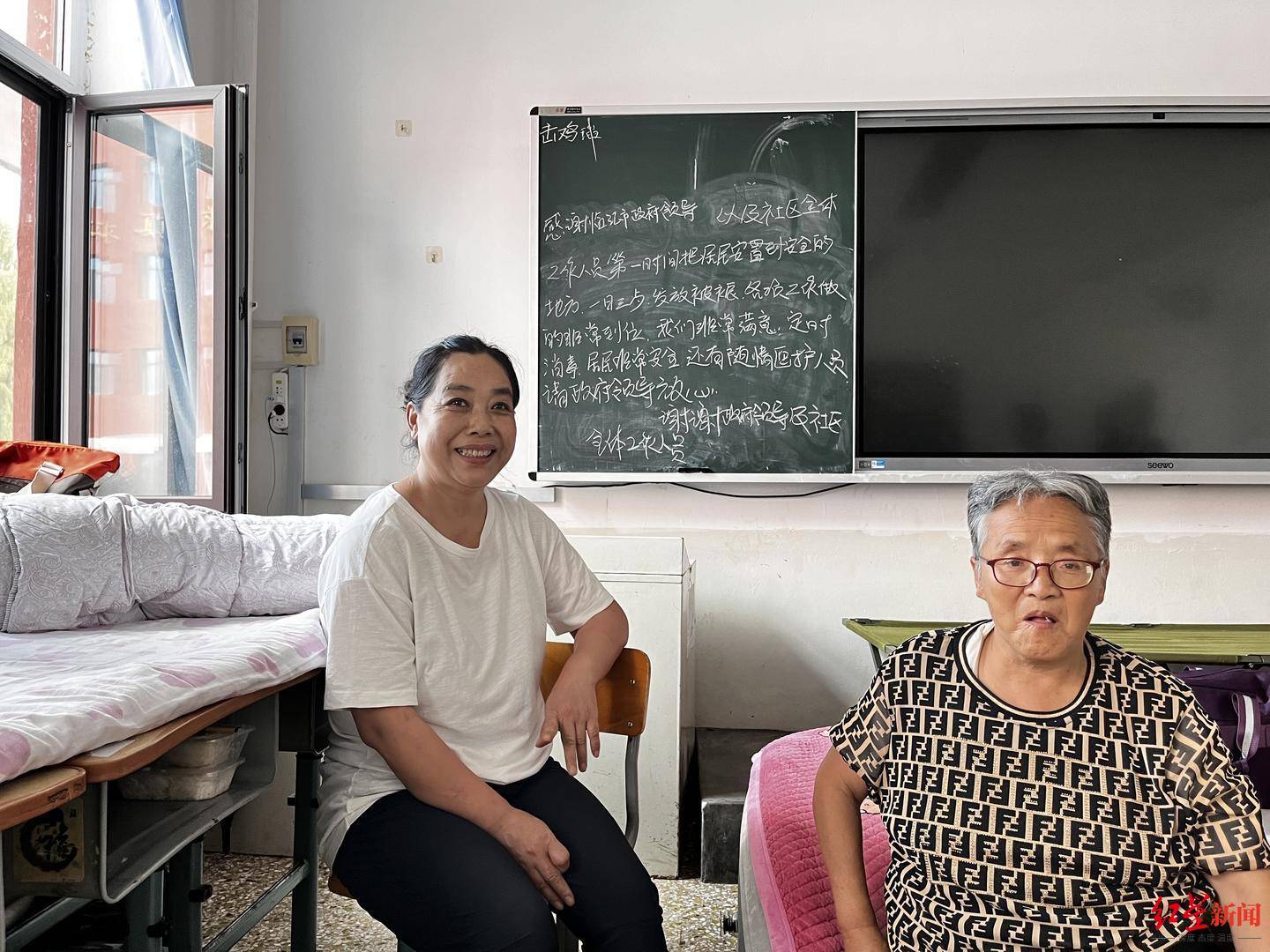 ▲林女士(左)在临时安置点,背后的黑板上是她亲手写下的《感谢信》