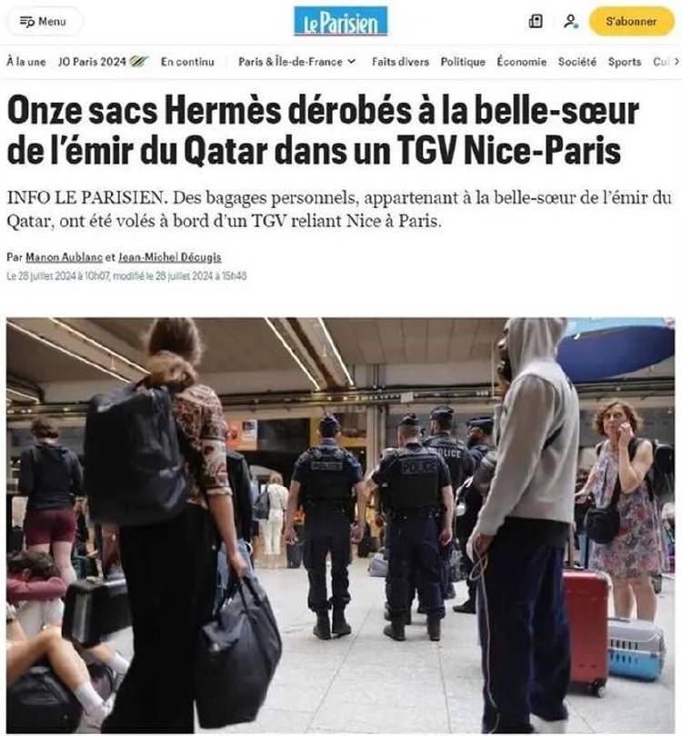 据报道,卡塔尔埃米尔的嫂子带着一个佣人于27日在法国南部戛纳登上一班开往巴黎的高速列车。没过多久,约在中午12时之后就发现自己的行李箱被人偷走,其中包含“非常贵重的个人物品”——11个爱马仕包,里面还有一些价值不菲的私人物品。