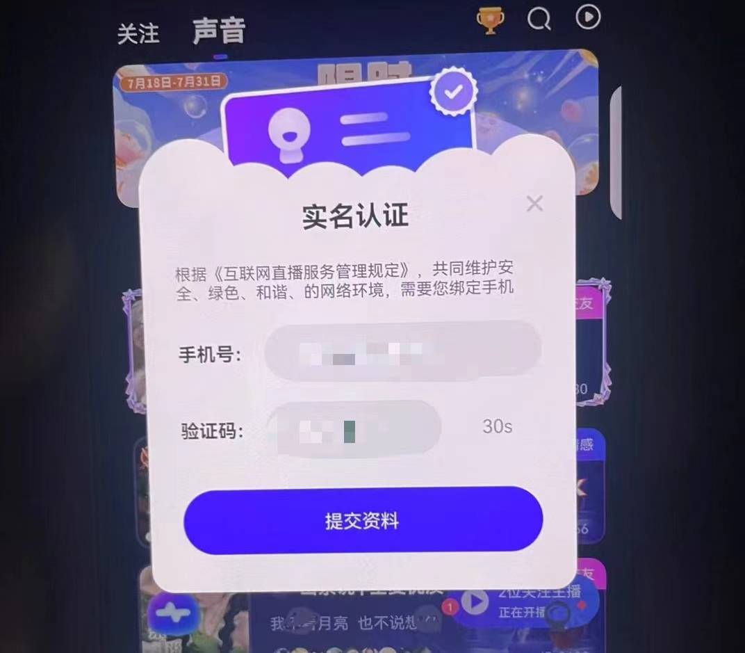 九派新闻实测发现,该APP只需输入手机号获取验证码后即可登录成功,登录成功后不用实名认证就可以充值,APP首页为正在直播的房间,且都是语音直播。