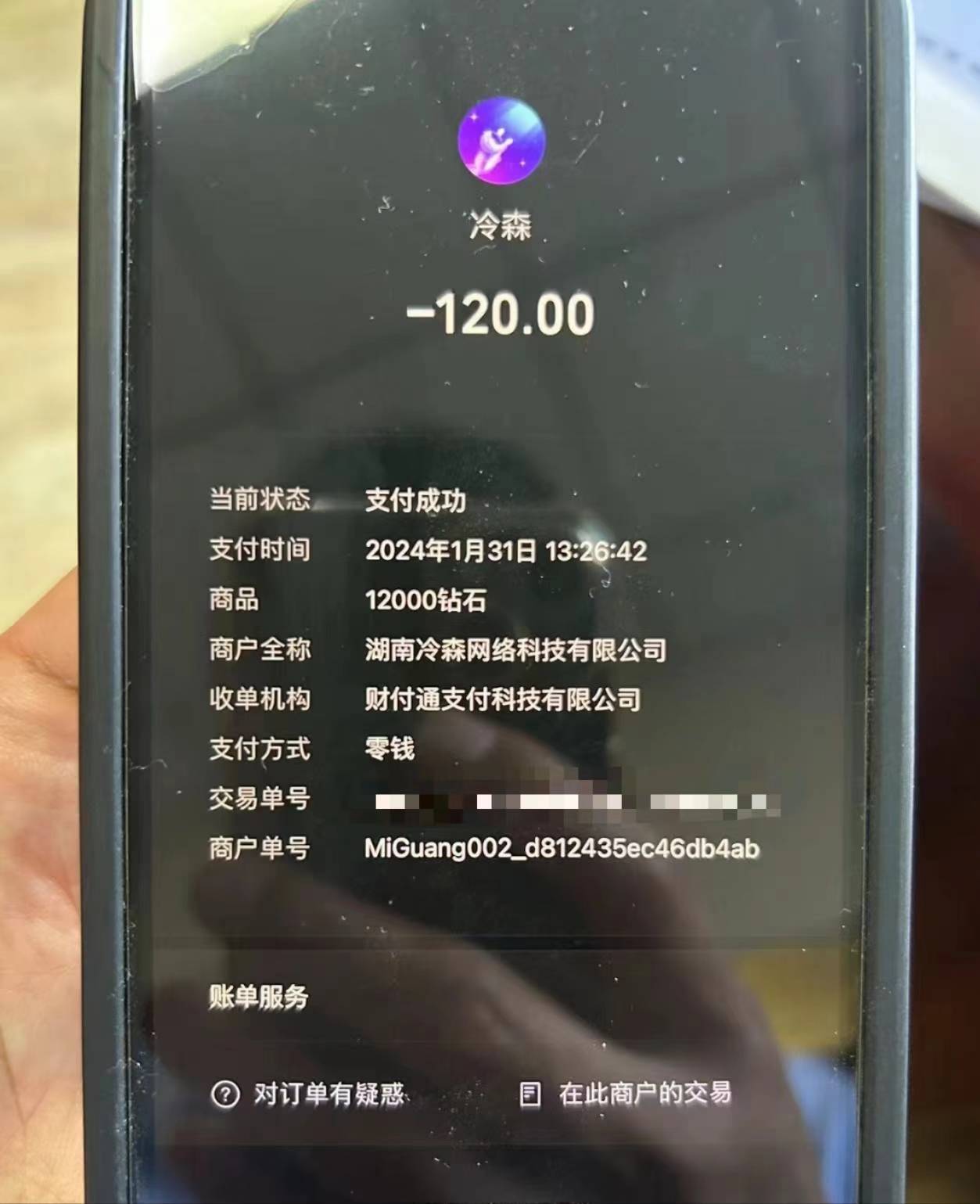 2023年12月1日起,女儿频繁向商户名为“冷森”的账号进行消费,商户单号上有“觅光”的拼音。最开始,消费数额均在10元以内,1个月后出现单笔100元的充值金额,2024年1月1日,出现单笔超过1000元的充值金额。且充值频繁,一天内充值次数超过20。不到半年时间,女儿充值近11万元。