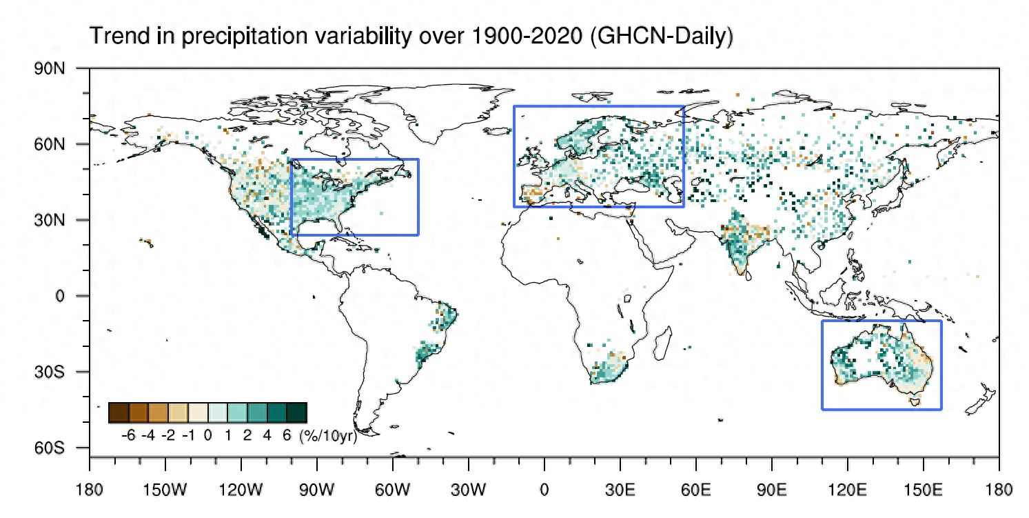 此次,科研人员利用国际上所有可公开获取的逐日降水观测资料,通过严格筛选和系统分析,揭示了1900年以来,在观测资料充足的地区,全球约75%的陆地上降水变率已增强,其中尤以欧洲、澳大利亚和北美东部最为显著。降水变率的增强涵盖多个时间尺度,包括天气尺度、月尺度和季节内尺度。就全球平均而言,逐日降水变率正在以每10年增长1.2%的速率增强。