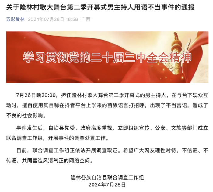 7月28日,广西隆林各族自治县联合调查工作组发布“关于隆林村歌大舞台第二季开幕式男主持人用语不当事件的通报”。7月26日晚20:00,担任隆林村歌大舞台第二季开幕式的男主持人,在与台下观众互动时,擅自使用其自称在短视频平台上学来的语言打招呼,出现了不当言语,造成了不良的社会影响。事件发生后,自治县党委、政府高度重视,立即组织宣传、公安、文旅等部门成立联合调查工作组,开展事件的调查处置工作。目前,联合调查工作组正依法开展调查取证。