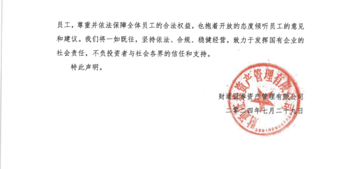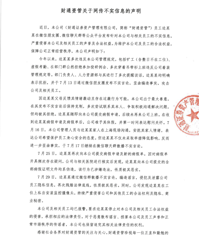 7月29日下午,财通资管发布声明称,7月29日,边某某通过微信群散播不实言论,编造谣言,侵犯及泄露公司员工隐私信息,再次践踏法律底线,性质极其恶劣。同时,公司发现边某某在工位上私自安装监控摄像头,持续严重侵害公司和其他员工的合法权利及隐私、商业秘密。公司及相关员工均已报警,要求边某某停止对公司及相关员工合法权益的侵害,承担相应的法律责任。