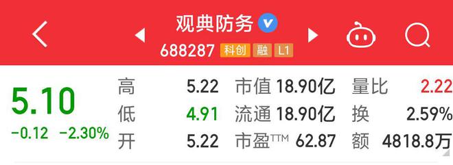 7月29日,观典防务(688287.SH)早盘快速下挫,一度跌近6%。截至早间收盘,跌2.30%,报5.10元/股。