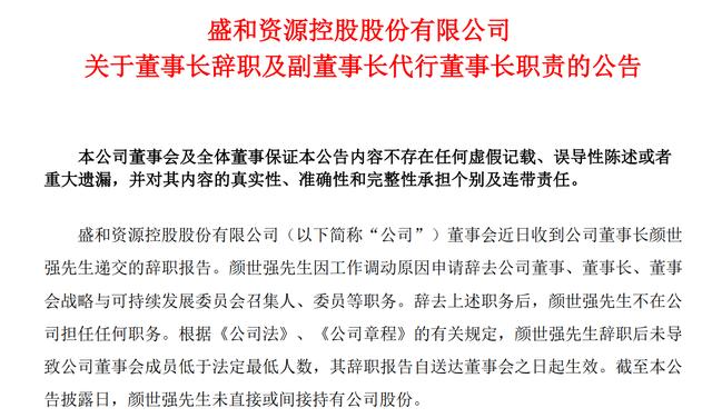 盛和资源在公告中称,辞去上述职务后,颜世强不在公司担任任何职务。根据《公司法》、《公司章程》的有关规定,颜世强辞职后未导致公司董事会成员低于法定最低人数,其辞职报告自送达董事会之日起生效。