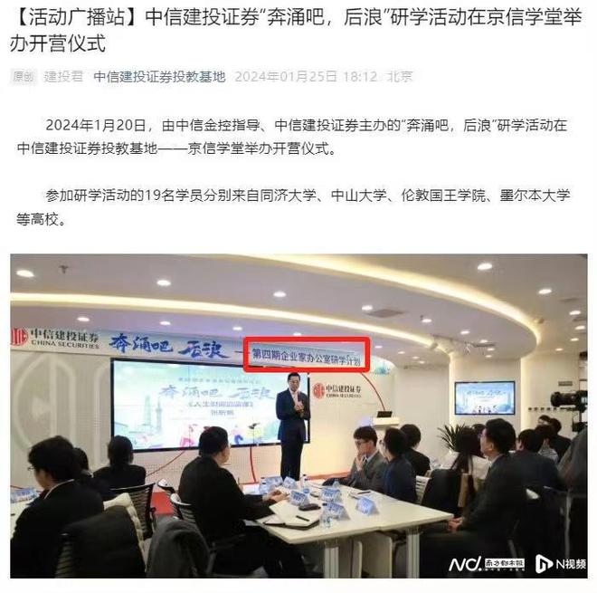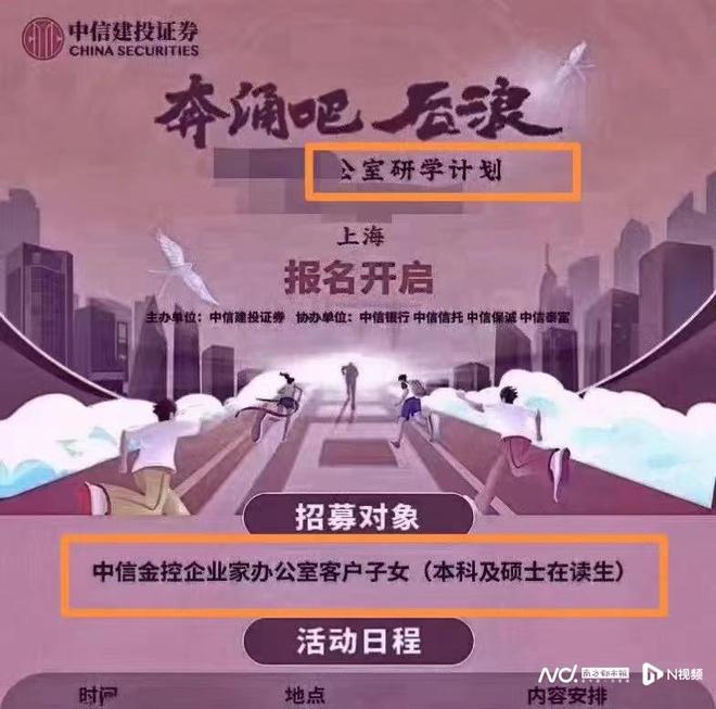 有网传图片显示,中信建投证券曾主办过“奔涌吧,后浪”的研学活动,其招募对象为“中信金控企业家办公室客户子女(本科及硕士在读生)”。