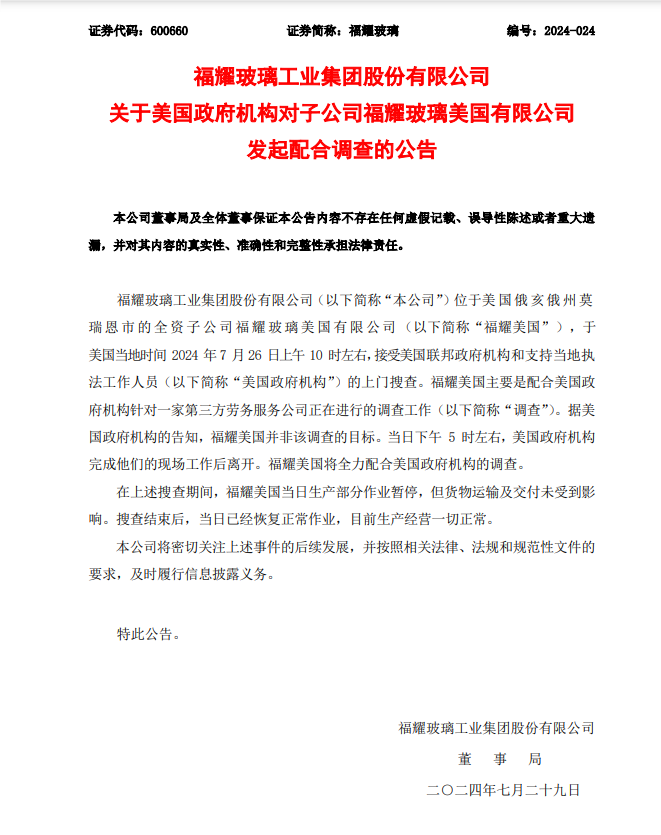 7月28日晚间,福耀玻璃发布公告显示,公司位于美国俄亥俄州莫瑞恩市的全资子公司福耀玻璃美国有限公司(以下简称“福耀美国”),于美国当地时间2024年7 月26日上午10时左右,接受美国联邦政府机构和支持当地执法工作人员(以下简称“美国政府机构”)的上门搜查。