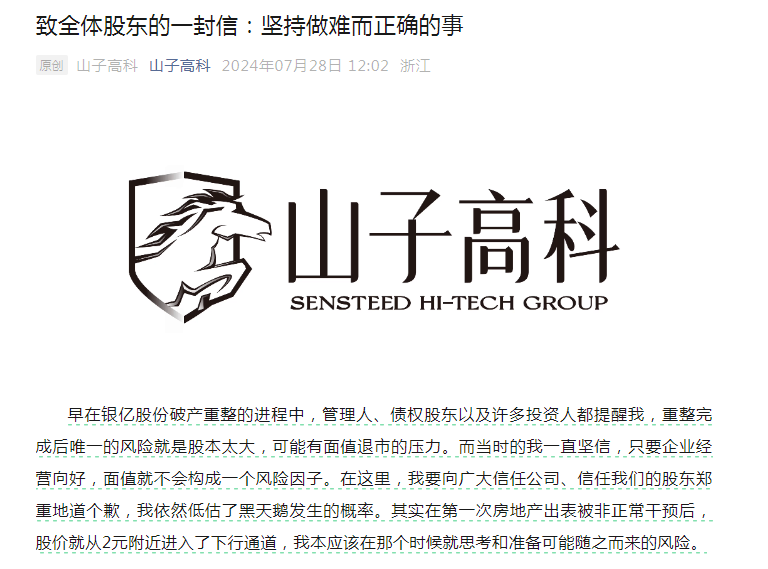 7月28日午间,山子高科微信号发布了由公司实际控制人、董事长、总经理叶骥署名的《致全体股东的一封信:坚持做难而正确的事》文章。文中,叶骥对低估了面值退市风险的发生概率向投资者表达歉意。
