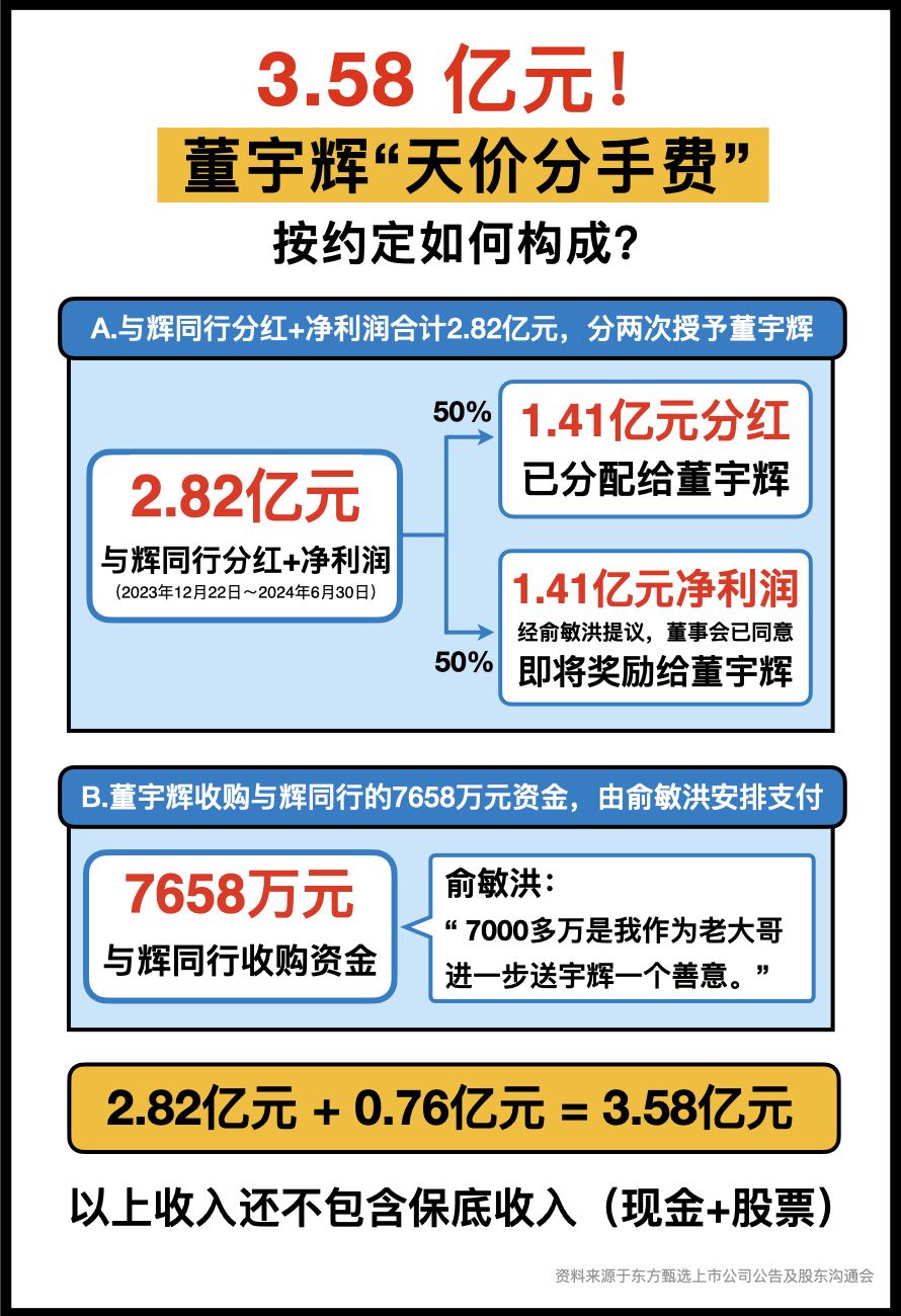 根据股东沟通会内容及此前东方甄选公告、俞敏洪个人信,董宇辉早前已先行入账1.41亿元,为与辉同行自2023年12月22日成立至2024年6月30日期间所赚取的纯利润的50%。根据协定,剩余1.41亿元净利润本应100%属于东方甄选,但在俞敏洪的推动下,剩余1.41亿元将全数奖励给董宇辉,也就是说,董宇辉将获得与辉同行半年间的全部净利润,为2.82亿元。俞敏洪称,分配给董宇辉的费用已经到了董宇辉个人账上,在财年报告时会体现出来。