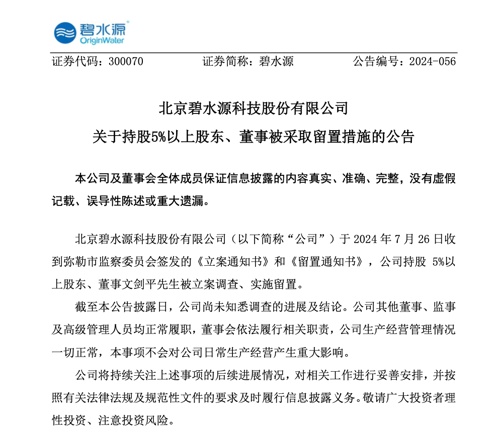 截至公告披露日,碧水源表示,目前公司尚未知悉调查的进展及结论。公司其他董事、监事及高级管理人员均正常履职,董事会依法履行相关职责,公司生产经营管理情况一切正常,本事项不会对公司日常生产经营产生重大影响。